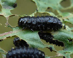 However, there is another way in which the story continues. These and almost any other guides you can find cover adults - eggs, larvae and pupae are rarely mentioned. Of course, it is adults that are usually found and which form the core of any biological collection. However, it does mean much of the group's life history is neglected. There are good reasons for this - juvenile stages tend to be small, hidden away (not always the case for larvae though - see below) and tricky to identify, the latter because in many cases they've never knowingly been found. A quick skim through 'the Atlas' shows just how often the words 'Larva - undescribed' are used plus of course larvae come in various stages/instars and these may vary considerably within a single species. A difficulty for sure, but also an opportunity for research and publication, and one that I'm becoming increasingly tempted to work on. To do so will not be easy and those gaps in research may mean a truly comprehensive guide is not yet possible, but I think that there is enough knowledge out there - as specimens, existing publications and the contents of entomologists' brains - to produce something genuinely interesting and useful (e.g. for conservation purposes). First job - collect existing literature, then work through the better known species and lastly fill in as many of the trickier gaps as I can. So, you read it here first  - a guide to the juvenile forms of leaf beetles, but don't hold your breath! And to show that not everything is hidden away and hard to find, I'll leave you with a cluster of larvae of the common dock beetle Gastrophysa viridula doing what it does best - eating dock leaves!